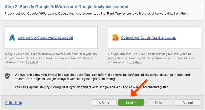 Tip: No need to add a Google Adwords or Analytics account for this step, just click Next.