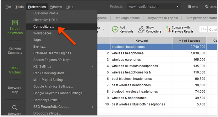5) You should now see the keywords you entered on Rank Tracker"s main Target Keywordsscreen. Now, go to Preferences > Competitors.