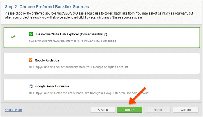 2) Make sure SEO PowerSuite Link Explorer is selected as your preferred backlink source, and click Next.