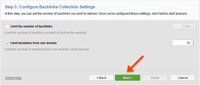 Tip: If your website has many sitewide links, you can end up having 100s or 1,000s of backlinks added to the SEO SpyGlass report from just one website linking to your domain. For that reason, it"s always a good idea to use this option when you"re not trying to analyze all of the different pages from one domain that is linking to your website. For this example, we will leave the default number of 10 backlinks per domain.