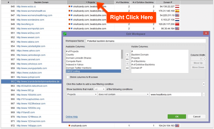 3) Analyze how valuable any of the links from these domains are by editing the currentPotential backlink domains workspace to add metrics that you feel are important to determine the strength of a link.