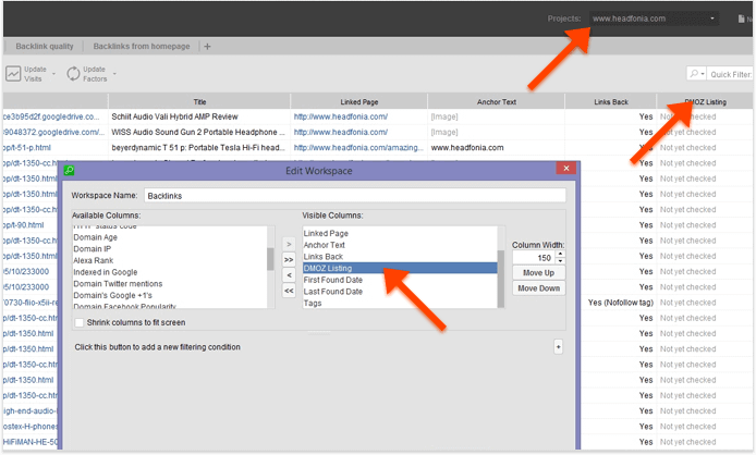 In the Linking Domains view, you can select the specific backlinks that you would like to check specific metrics for; whether it"s a listing in Dmoz, the Moz Domain Authority for the link, etc.