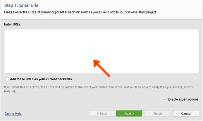 Leave the Add these URLs as your current backlinks box unchecked, make sure Enable expert options is checked, and then click Next.