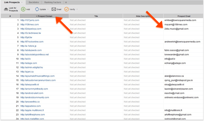 5) You should then see all of the prospect domains that you"ve selected listed in the main workspace, along with an email address if LinkAssistant was able to find one.